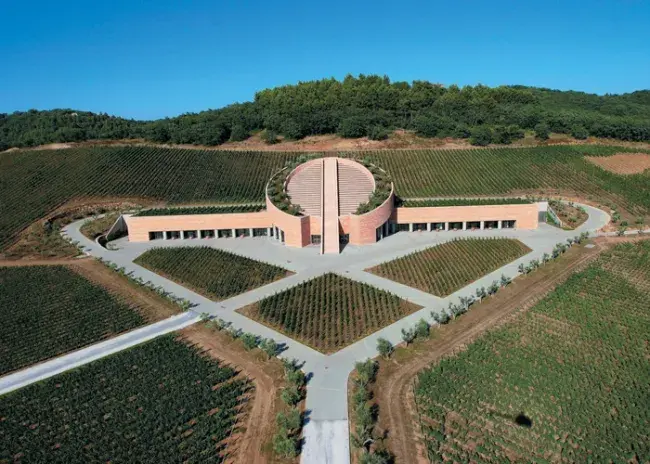 The gravity flow winery was designed by celebrated Swiss architect Mario Botta. The property encompasses 300 hectares, whose vineyards and climate are influenced by the nearby Tyrrhenian Sea. Its soils are comprised of Tufo (volcanic stone), and clay in the hilltops and calcareous alluvial in the lower sites. Attilio Scienza is in charge of the viticulture. Each vineyard site is farmed with total respect for sustainability. Vittorio and Francesca Moretti are also the father and daughter team behind the Petra winery. They were largely involved in architect Mario Botta's project. It was clear from the start that the winery was going to be built with the prefab building parts the Moretti family had made their success with. Also, an idea of Vittorio Moretti was the long, slightly theatrical tunnel dug into the hill, serving as a natural wine cellar lined up with barriques.