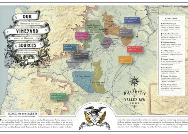 Purple Hands Vineyards celebrates site-specific pinot noir and chardonnay that unearth the Willamette Valley’s long evolutionary history. Using traditional winemaking techniques, they strive to produce wines that convey an honest expression of each of their vineyards—its grapevines and cultivation, soil and stone, sunshine and rain. All of their wines undergo native fermentation and remain unfined and unfiltered at bottling to preserve their natural, wild character. Achieving elegance in this pursuit is the passion and art of their craft.